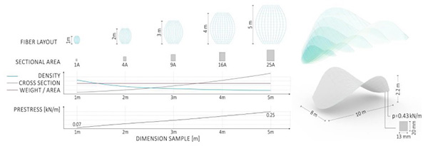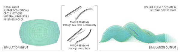 Thus, it offers a high degree of customization and in return minimizes material use, labor and waste. Fiber reinforced composite strands are sewn onto a flat prestressed high-strain membrane with the tailored fiber placement technique. Through the prestress release the contracting membrane actuates active bending of the composite elements, thus the system self-forms into an anticipated double curved geometry (Figure 1).