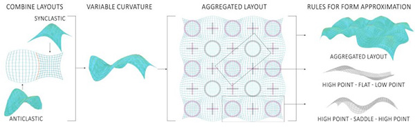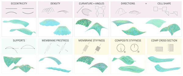 Yet, their behavior is not investigated to a degree where an anticipated geometry with controlled Gaussian curvature can be formed. Moreover, this would demand freedom and control in the stiffness layout. Digital fabrication with the tailored fiber placement technology (TFP), originating from the aerospace industry, enables a precise and automated fiber reinforced composite application onto a substrate membrane. Conventionally their fiber layouts are informed for an optimized structural performance, while their geometry is formed through molding.