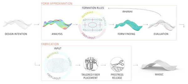 Its geometric outcome is tailored by the stiffness distribution and fiber layout. Through extensive form-finding with nonlinear finite element methods, self-formation rules are derived that enable form approximation. A process where the input parameters of the system are determined so that the self-formation satisfies an initial design intention. The research on the MASGC is concluded in a design to fabrication framework.