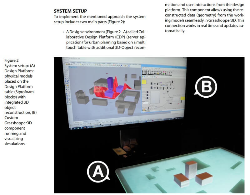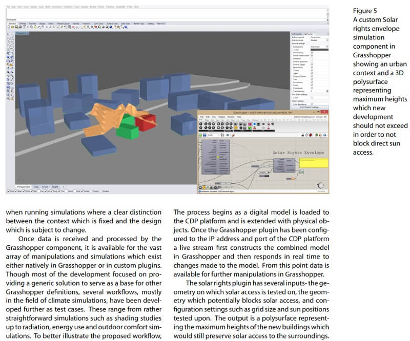 The environment combines the reconstructed physical models with the digital one (surrounding buildings) and passes the information to a custom Grasshopper3D plug-in which serves as a link to existing and custom developed simulative tools. All simulations are performed and visualized in real time to support the intuitive and iterative design process.