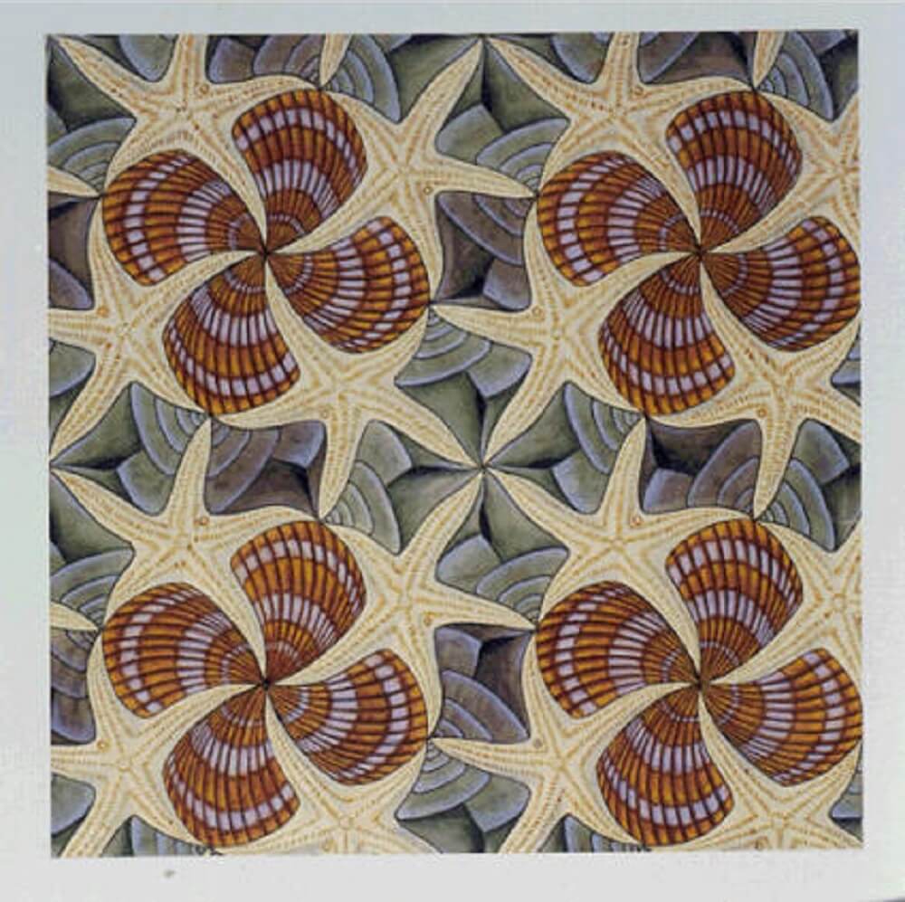 Escher created his tessellations by using fairly simple polygonal tessellations, which he then modified using isometries. Escher organizes his tessellations into two classes: systems based on quadrilaterals, and triangle systems built on the regular tessellation by equilateral triangles. The bulk of Escher’s tessellations are based on quadrilaterals, which the novice will find much easier to work with. The less common triangle systems are easily identified because three or six motifs will meet at a point, and the entire tessellation will have order 3 or order 6 rotation symmetry.