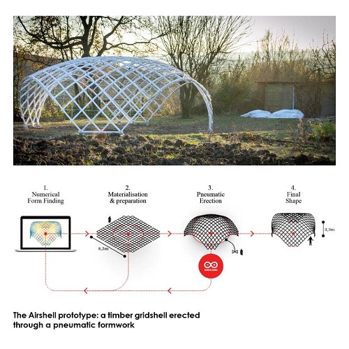 This paper presents the construction of Airshell, a small timber gridshell prototype erected by employing a pneumatic formwork.