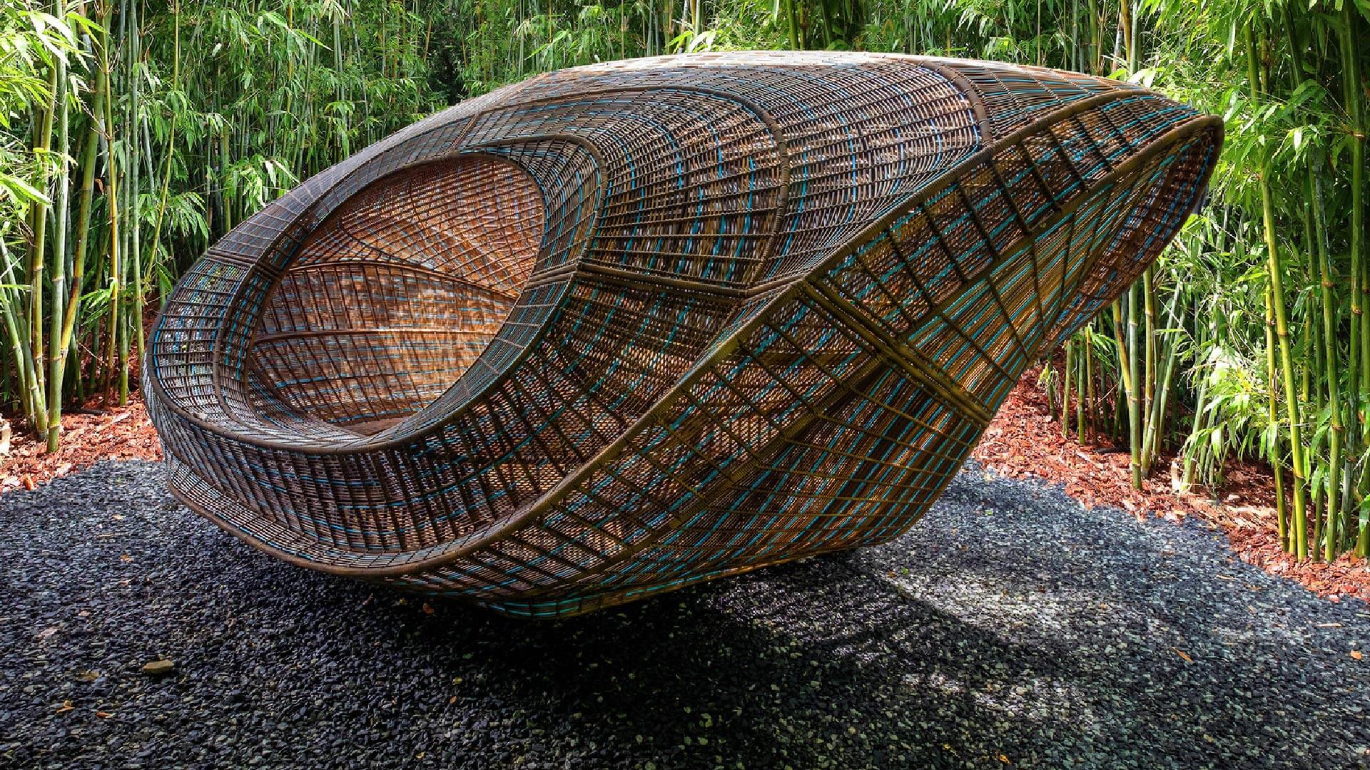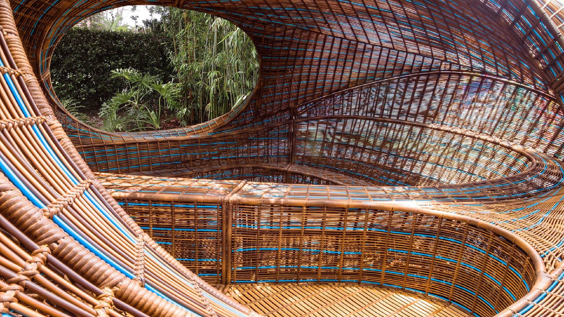 the project forms part of the revolution precrafted pavilion series, a collection of structures whose wide variety of functions are designed to complement existing spaces. constructed from strands of 100% recyclable high-density polyethylene (HDPE), the project was designed and developed digitally, before being handwoven by highly skilled craftsmen.