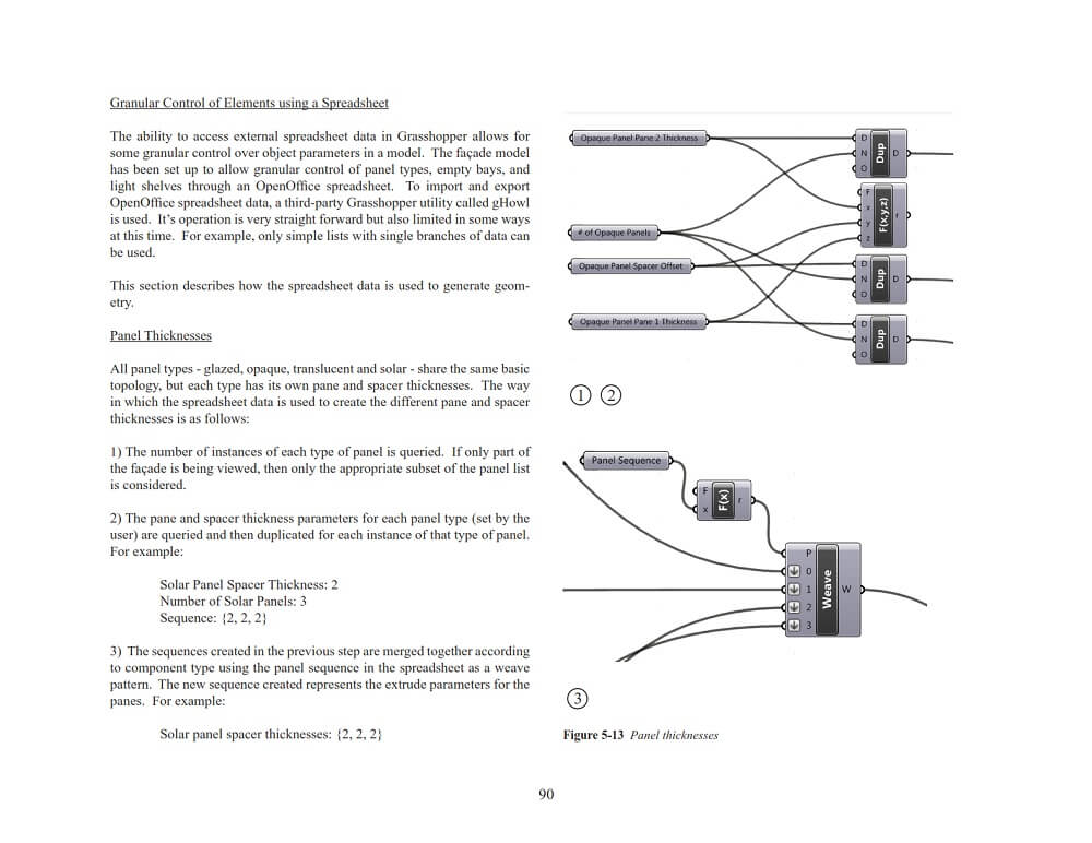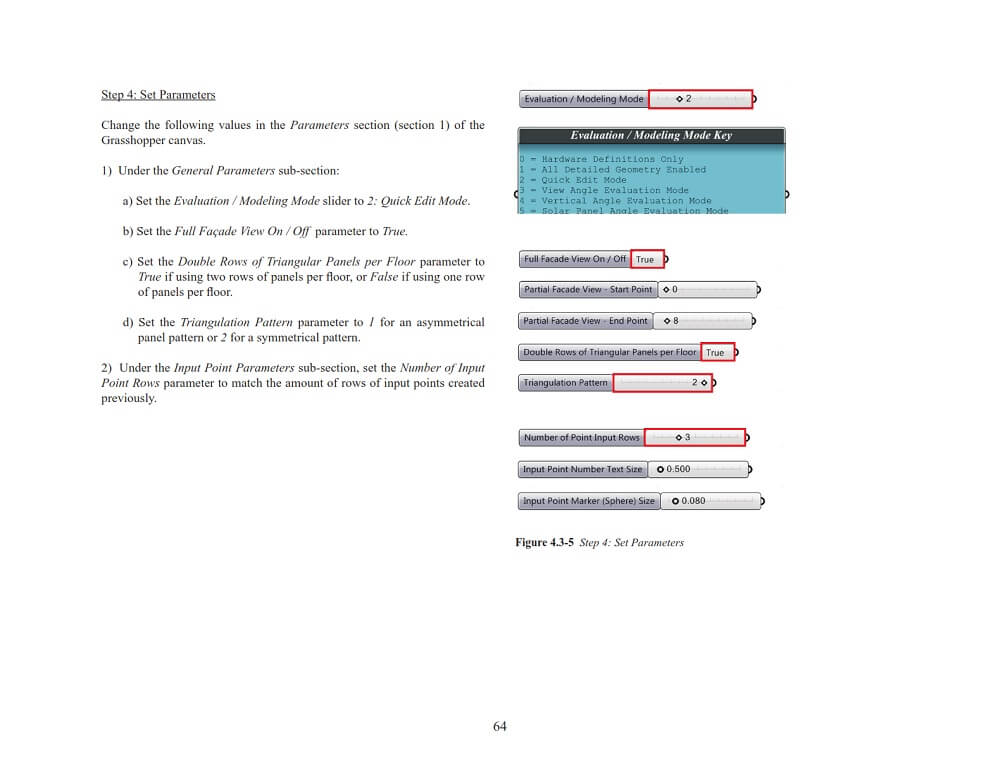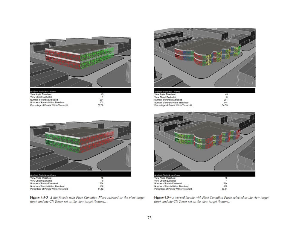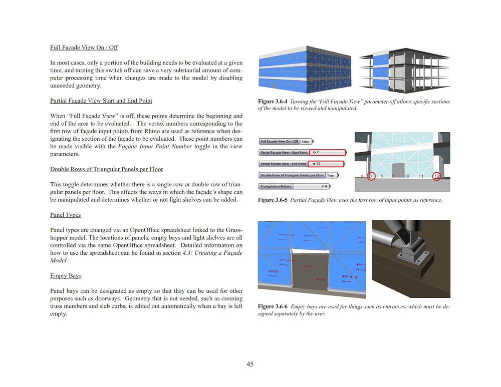 The façade system is modeled in Grasshopper 3D, a parametric modeling plug-in for Rhinoceros 3D. The model has built-in analysis tools to help the user optimize the façade for daylighting, energy efficiency, or views within any given context, as well as tools that alert the designer when fabrication or construction constraints are being violated.