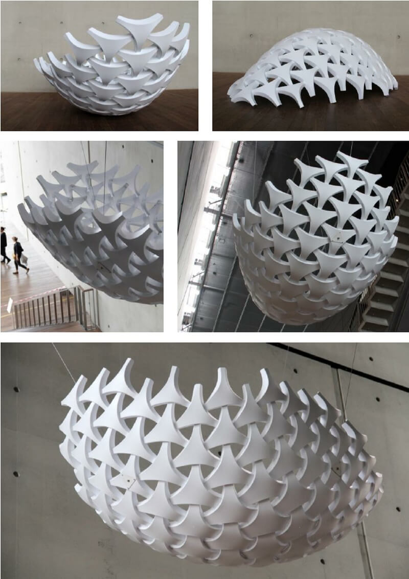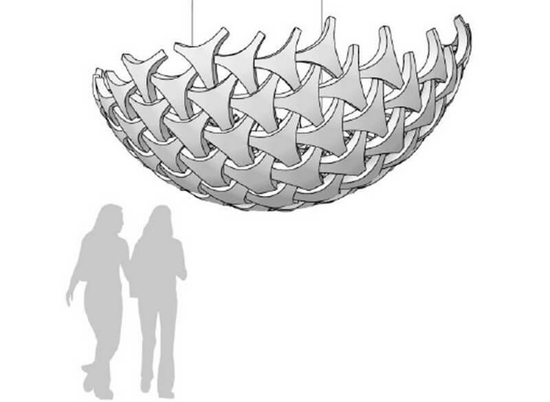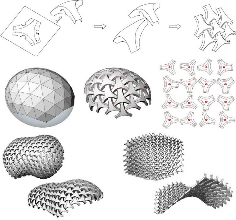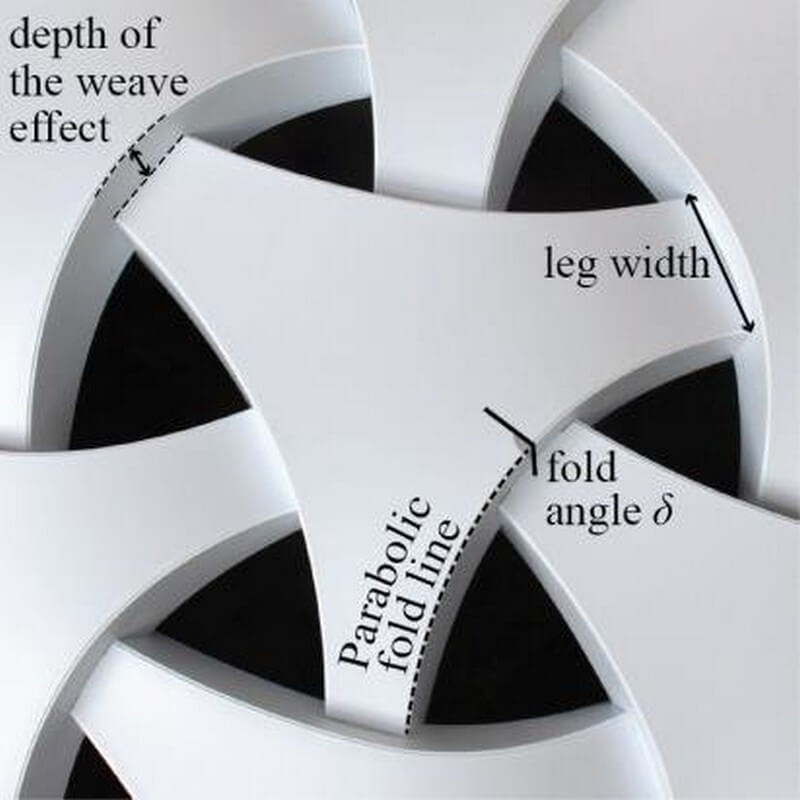 Curved-line folding is the act of folding a flat sheet of material along a curved crease pattern in order to create a three-dimensional shape. It is a creative and innovative way to produce lightweight and geometrically stiff components using only sheet materials. The pavilion by Stijn Brancart, Aline Vergauwen, Kelvin Roovers and Niels De Temmerman presented here integrates this principle in a kit-of-parts system. After being cut out of flat plates, the components get their 3D shape by folding them along a set of predefined curved lines. This deformed geometry, variable in its degree of bending, results in a structurally efficient ‘building block’ that can be combined into different structural configurations depending on its mode of assembly. The components form a weave pattern by connecting them ‘flap to leg’ respectively.