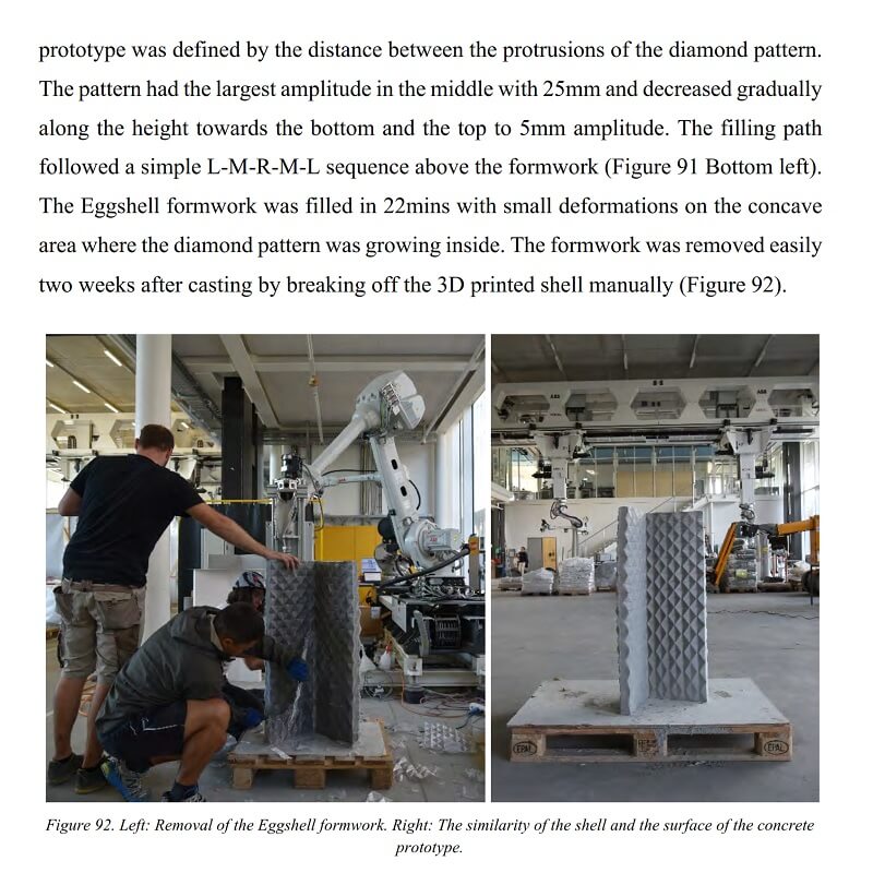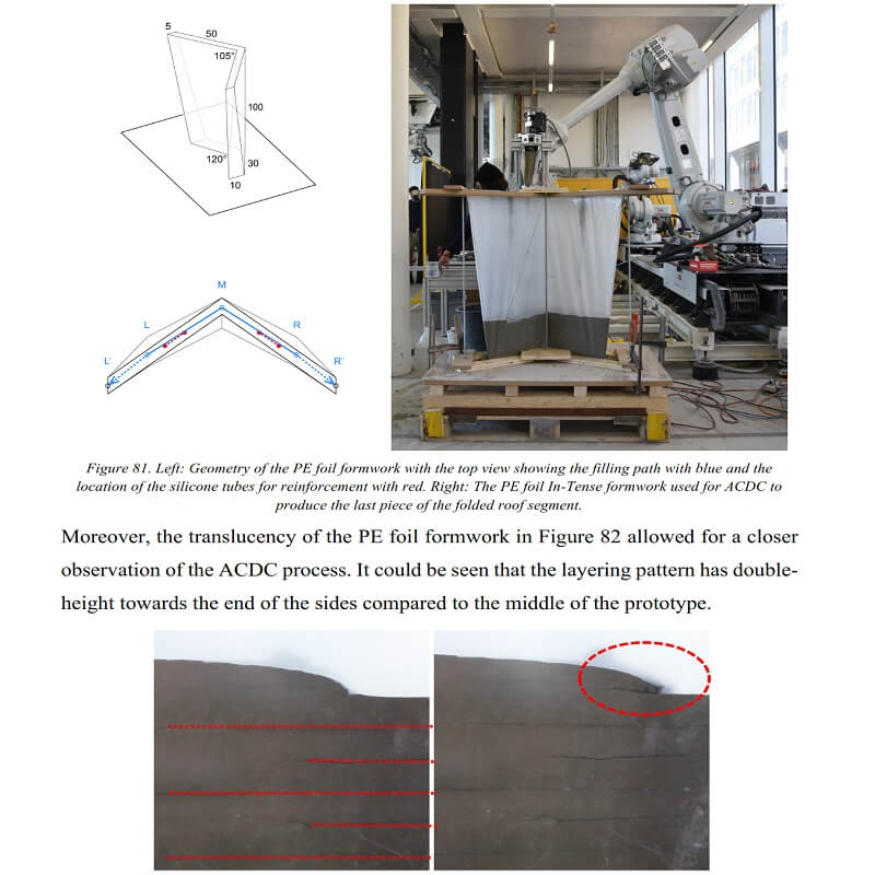 In ACDC, stationary weak formworks are filled robotically with a fast-hardening set on demand concrete to reduce the pressure from casting. The robust production of thin folded structures with ACDC was demonstrated with various cheap and simple formworks, such as the In-Tense system where thin materials are held by rigid frames, the 3D printed Eggshell formwork or the curved folded paper board formwork.