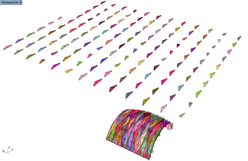 The “TPS_DiamondMesh” component lets you quickly generate diamond folds (also called Yoshimura folds) based on freeform surfaces. Note that this tool is meant for discrete (timber) plate structures, built from separate pieces which are connected with joints. The resulting meshes can be, but are not necessarily flat-foldable as in Origami.