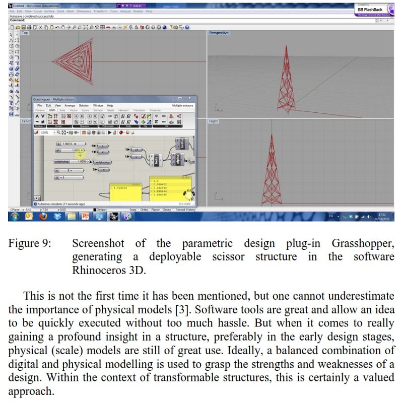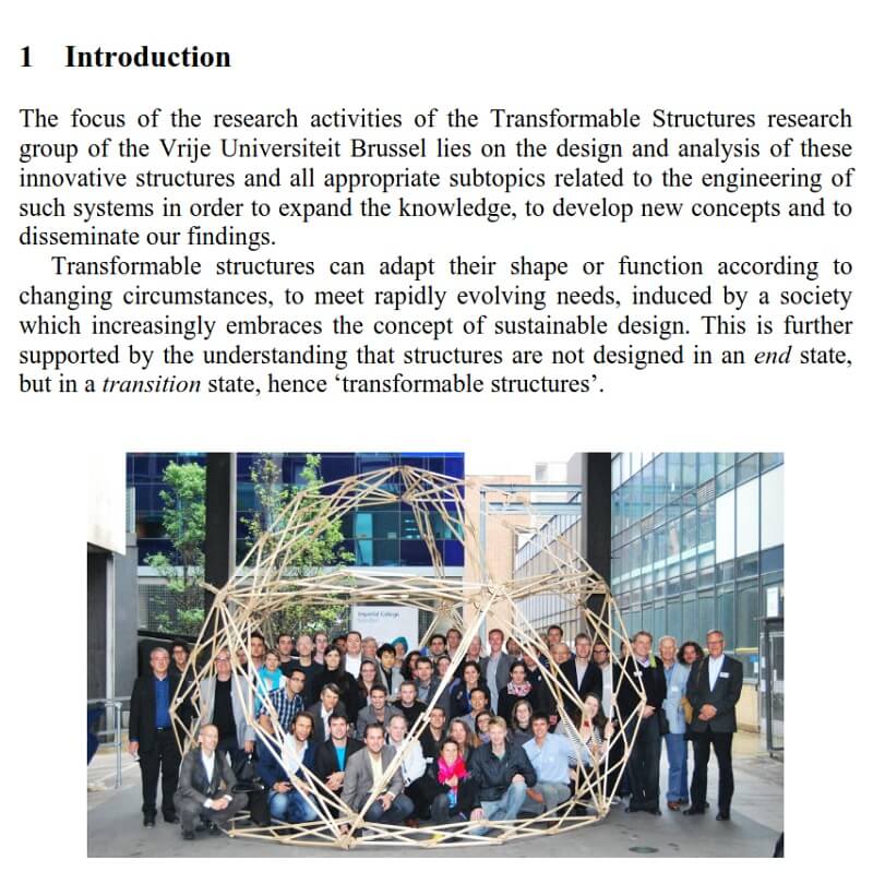 This paper by N. De Temmerman, L. Alegria Mira, A. Vergauwen, H. Hendrickx & W. P. De Wilde explores the possibilities of transformable structures in architectural and structural engineering. Key aspects concerning the design, analysis and construction of mobile, as well as adaptable constructions, are explained. The transformation of such structures, intended to meet changing requirements, is done by using mechanisms (deployable/foldable) or reconfigurable components (demountable kit-of-parts). Transformable structures can adapt their shape or function according to changing circumstances, to meet rapidly evolving needs, induced by a society which – progressively – embraces the concept of sustainable design. This is further supported by the understanding that structures are not designed in an end state, but in a transition state, hence ‘transformable structures’. Based on how this transformation is realised, two groups of structures can be distinguished. The transformation of the structure is primarily done by either: