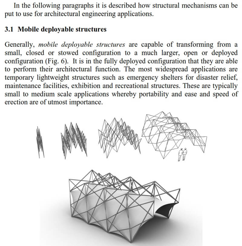 (i) incorporating a kinematic mechanism, enabling the structure to deploy from a compact configuration (e.g. for transport) to a larger, expanded state in which it can fulfil its architectural function (e.g. providing shelter) or,