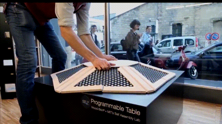 MIT Self-Assembly Lab has come up with an active design for a table that can reconfigure into various shapes. Manufactured by Italian brand Wood-Skin, the prototype of this self-assembling table was showcased at Milan Furniture Fair.