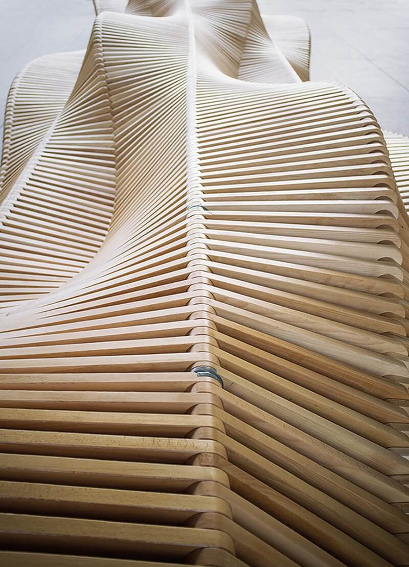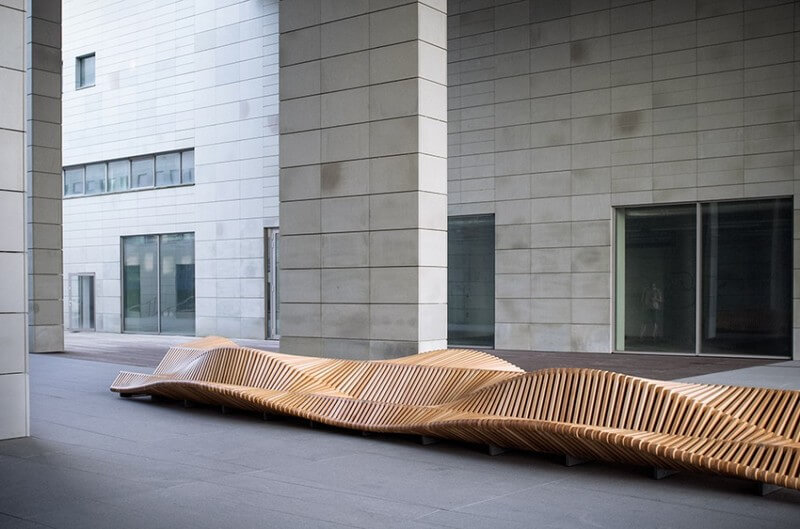 Set in the space of the minimalist Library building, it attracts attention but does not dominate. Where does the name come from? The order of letters in “uiliuili” word resembles the undulating shape of the bench.