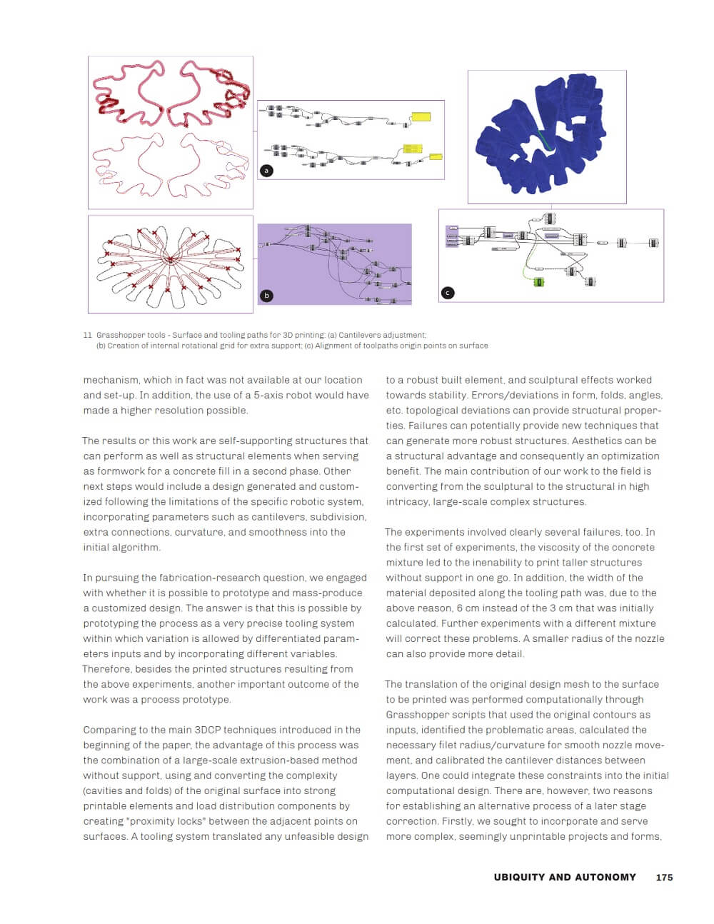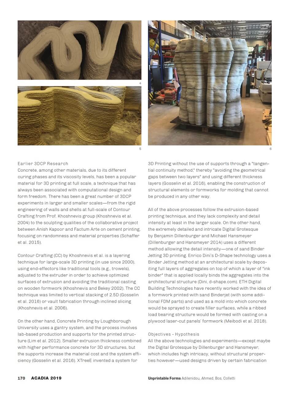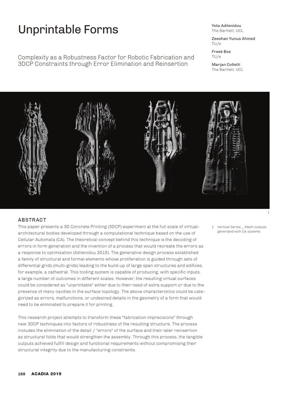 This paper by Yota Adilenidou, Zeeshan Yunus Ahmed, Freek Bos and Marjan Colletti presents a 3D Concrete Printing (3DCP) experiment at the full scale of virtual architectural bodies developed through a computational technique based on the use of Cellular Automata (CA). The theoretical concept behind this technique is the decoding of errors in form generation and the invention of a process that would recreate the errors as a response to optimization (Adilenidou 2015). The generative design process established a family of structural and formal elements whose proliferation is guided through sets of differential grids (multi-grids) leading to the build-up of large span structures and edifices, for example, a cathedral.
