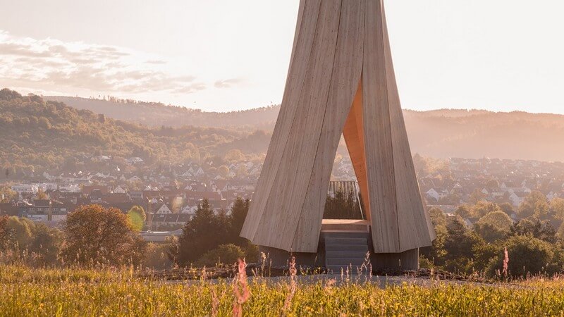 The Urbach Tower constitutes the very first structure worldwide made from self-shaped, building-scale components. It not only showcases this innovative manufacturing approach and resultant novel timber structure; it also intensifies the visitors’ spatial involvement and landscape experience by providing a striking landmark building for the City of Urbach’s contribution to the Remstal Gartenschau 2019.