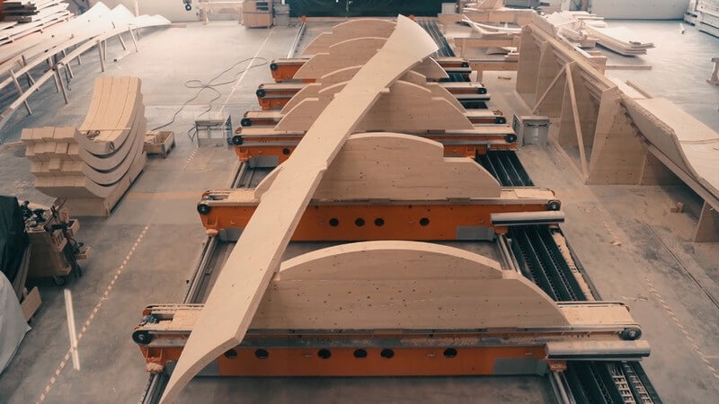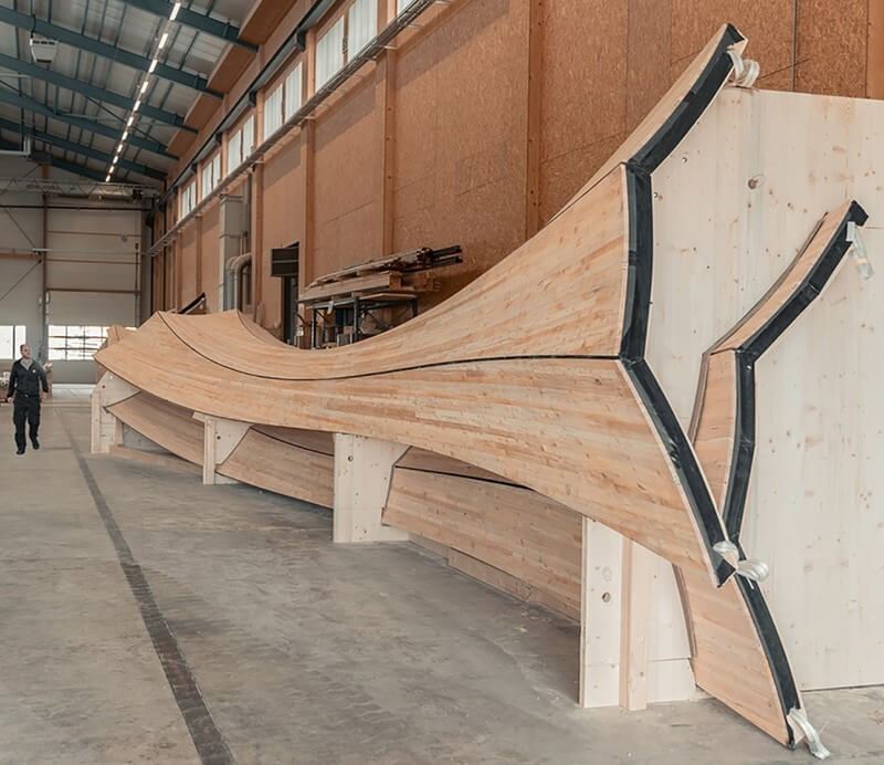 The self-shaping components are made entirely of spruce wood boards sourced regionally from Switzerland. Individual components span up to 15 m with a radius of 2.40 m and a structural thickness of only 90 mm. The components are 5-Axis CNC cut and detailed from half cylinder blanks and pre-assembled into building groups of three components for transport, including water barrier and external wood cladding.