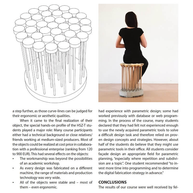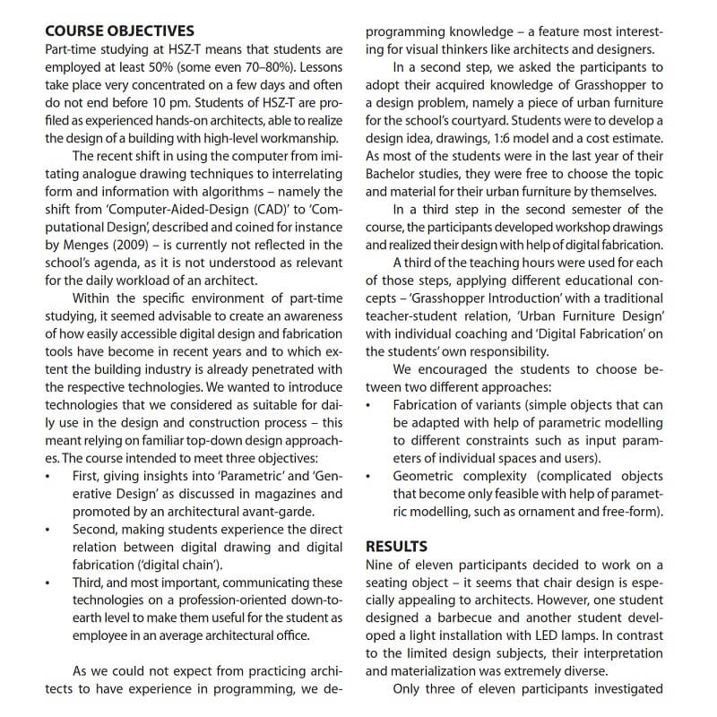This paper by Christoph Schindler and Kyeni Mbiti, discusses a design course covering the complete process chain from parametric modelling to digital fabrication. The course was run as a 2-semester elective course at Hochschule für Technik Zürich (HSZ-T), a Swiss University of Applied Sciences that offers as the only school in Switzerland a Bachelor of Architecture as an extra-occupational part-time study (joining ZHAW in 2012).