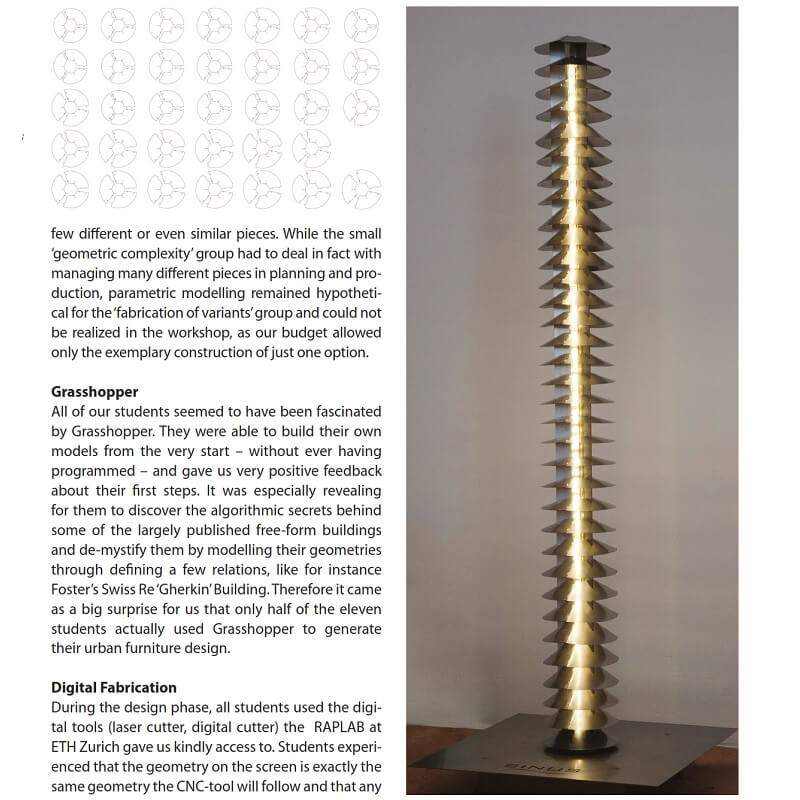 The design objective was to develop pieces of urban furniture with help of parametric modelling and fabricate them with digital tools. Each of the eleven objects was realized in collaboration with a different professional enterprise chosen by the student, which let them experience a wide range of different materials and production technologies.