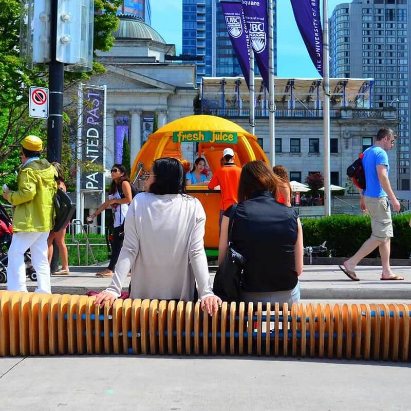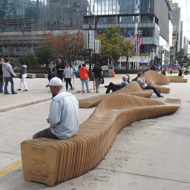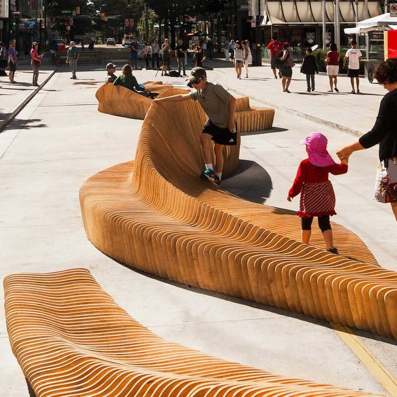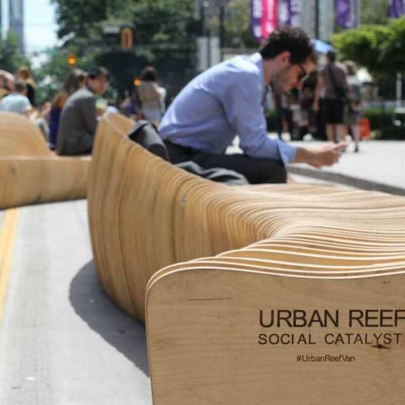 Meandering down a section of Robson Street on the iconic 800 block in downtown Vancouver, passers-by can sit, relax, play, and socialize on the “Urban Reef” installation. Designed by Kaz Bremner and Jeremiah Deutscher with local furniture collective Higher Works, Urban Reef won the inaugural 2014 VIVA Vancouver: Robson Redux design-build competition out of 78 submissions worldwide.
