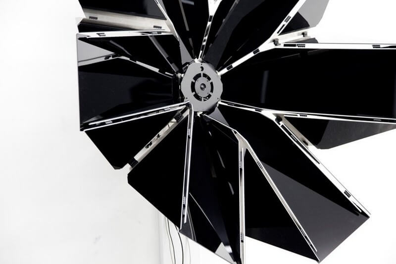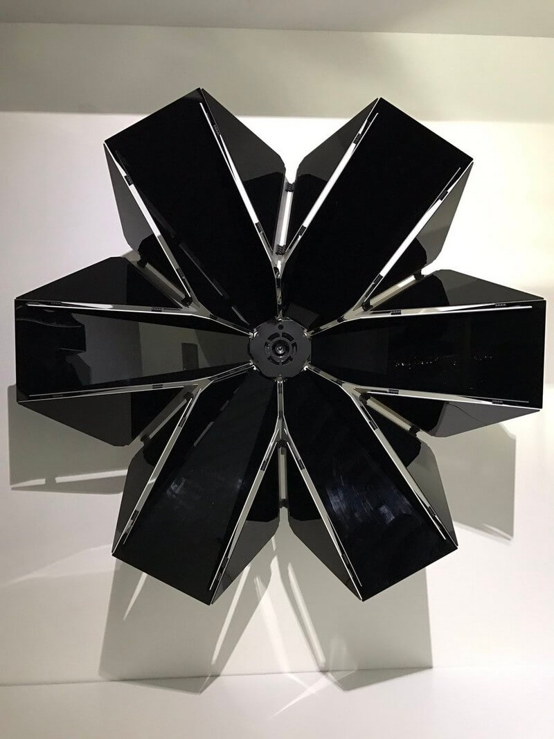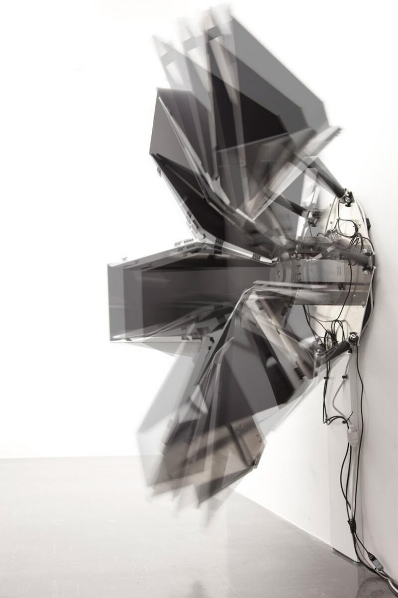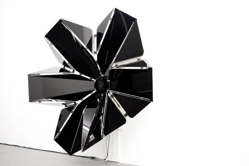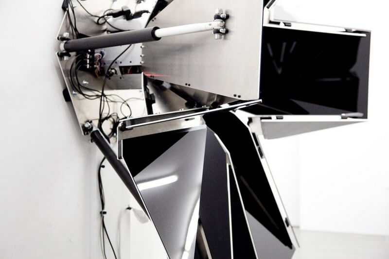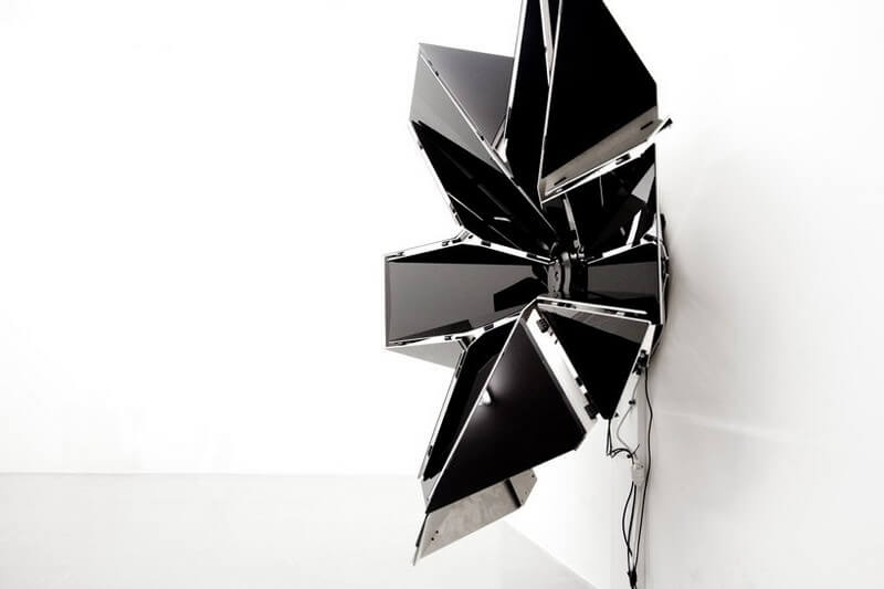 Versus by David Letellier is a sound installation consisting of two kinetic sculptures placed face to face. Each sculpture is made out of 12 triangular panels, hinged and powered by six linear actuators, controlled by a specific program. At the center of each corolla, a loudspeaker and a microphone allow to play and record sounds.