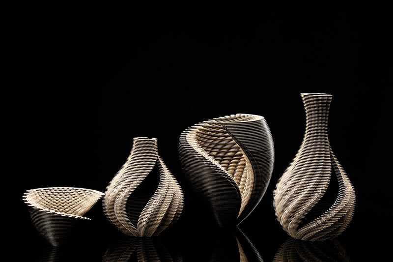 They are then arranged in an interactive parametric design phase where various curves and values are tuned through visual feedback to obtain the final shape. Computers and a laser cutter compute the shape of, and physically cut the many hundreds of parts. The assembly of each vessel is done entirely by hand using glue, pins and a scalpel.