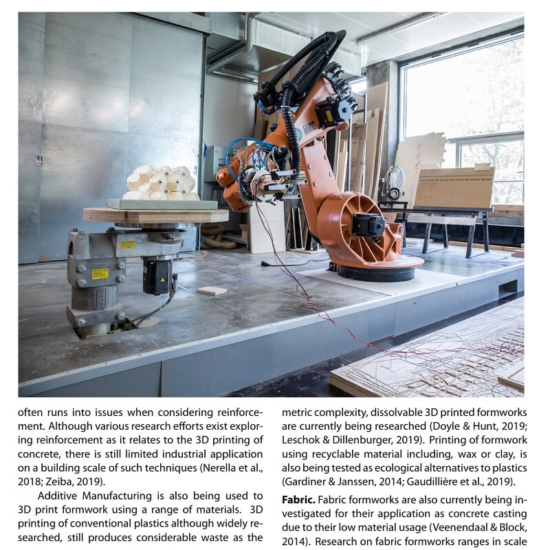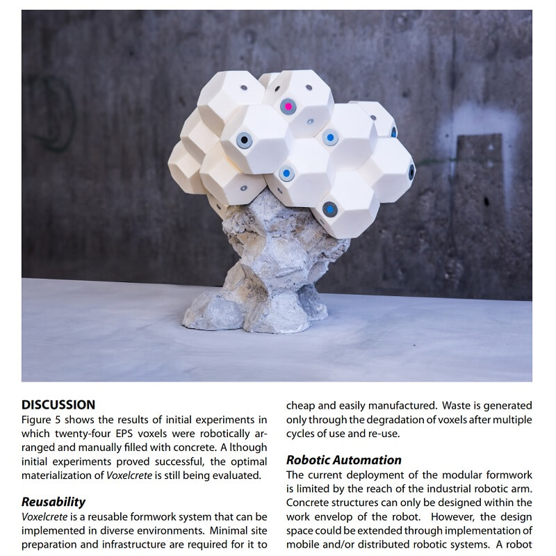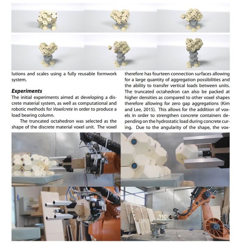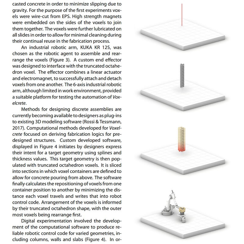 This paper by Samuel Leder, Ramon Weber, Lauren Vasey, Maria Yablonina and Achim Menges presents Voxelcrete, a discrete, voxel-based, reconfigurable slip formwork system for the creation of non-standard concrete structures. Authors aim to transition from highly individualized and complex formworks tailored for individual structures to simple formworks that can be reused and reconfigured to realize a variety of designs.