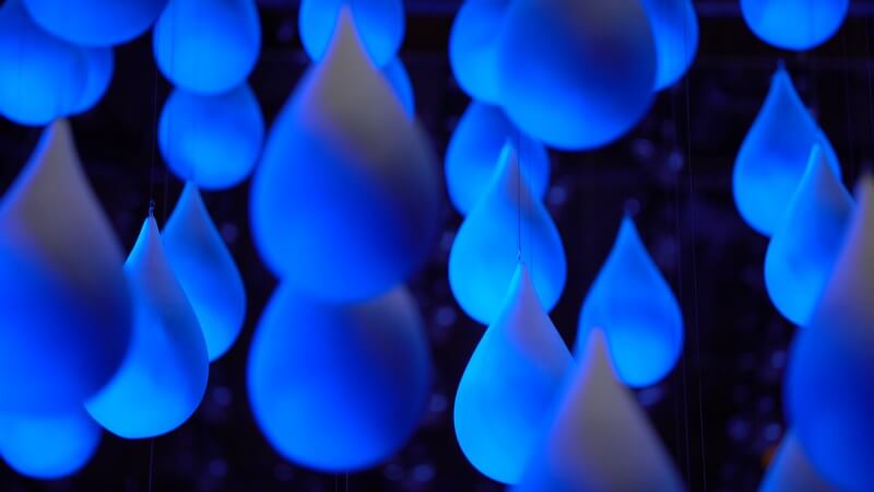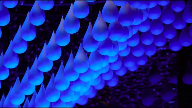 Water Ripples is composed of 600 handmade water droplets, controlled by custom designed motorized winches. Custom circuit boards and software allow the elements to animate through sculptural forms, creating impressions of waves and underwater life around visitors. The sculpture moves smoothly through algorithmically generated ambient wave forms, descending to surround visitors with a variety of water-inspired forms when an event visitor contributes a donation.