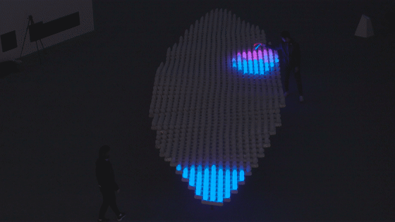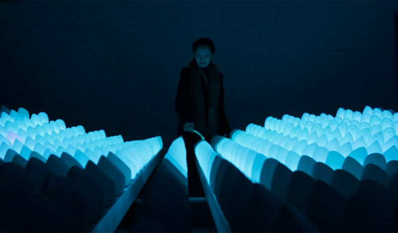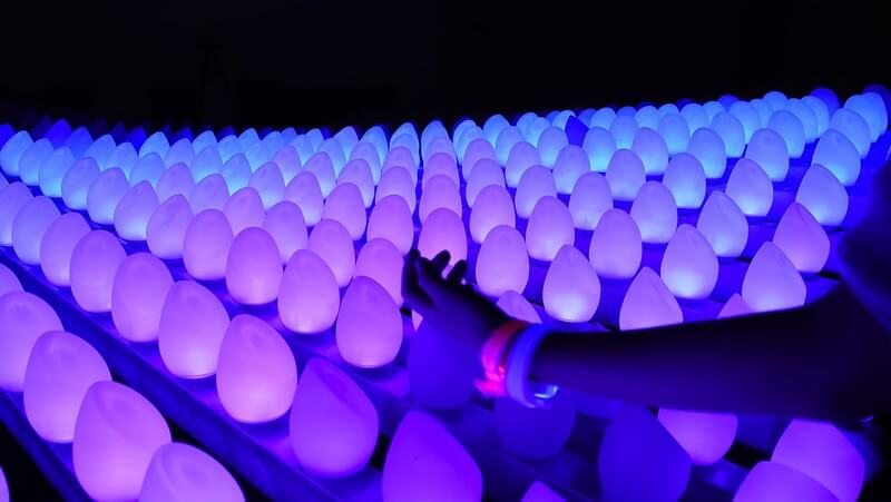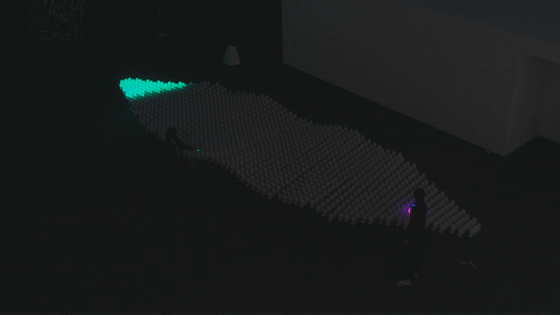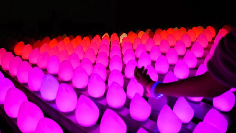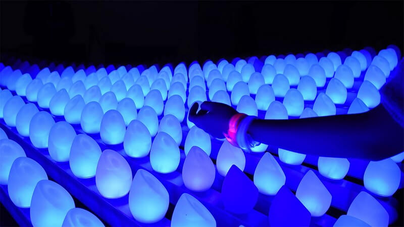 Each of the teardrop-shaped light bulbs is embedded with custom-made electronics that detect and react to changes in light and colour. When any of the light bulbs detect a change in colour or light, it displays the colour accordingly.