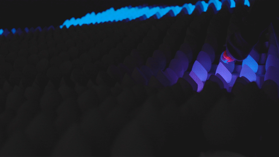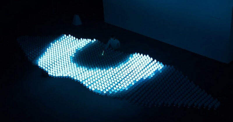 Wavelet is an impressive interactive lighting installation developed by Chinese media group GeeksArt. It uses the changing light to mimic the flowing water. Wavelet is composed of 1,300 light-responsive light bulbs. Each light bulb is designed in an arc shape, which gives the light wave a distinct direction.