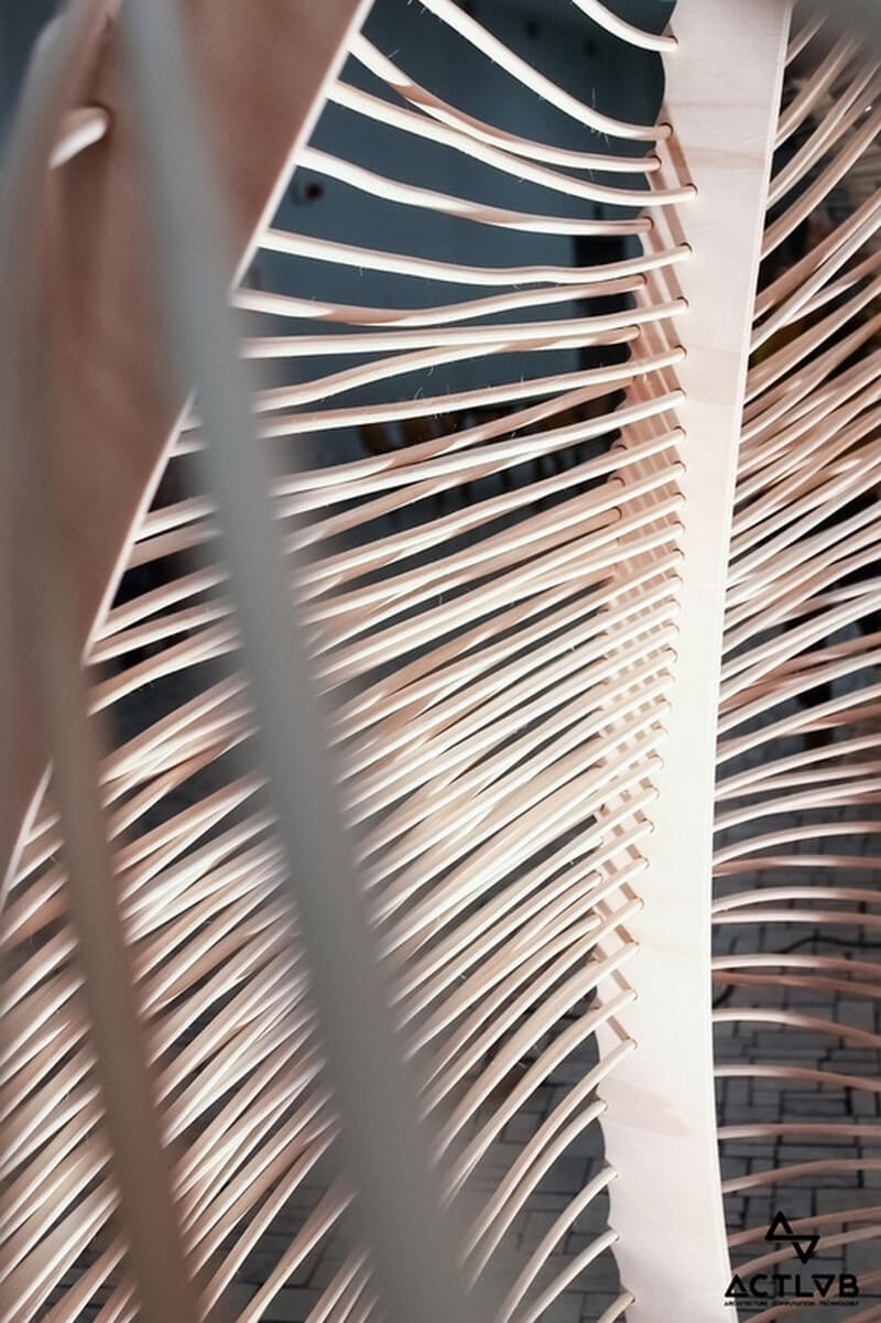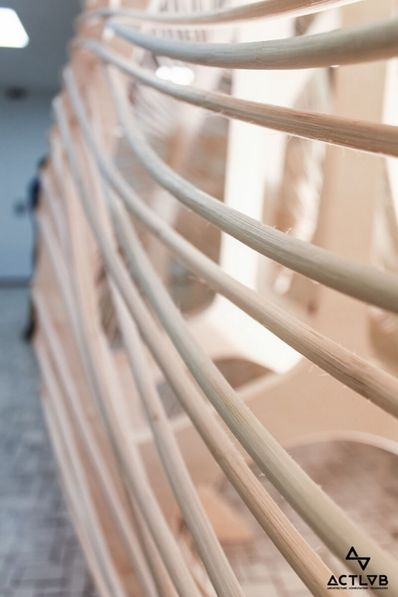 With the implementation of custom-based design algorithms the bending behavior of woven rattan strands has been computationally embedded and later tuned by extrinsic parameters to modulate the overall geometric features and the gradient of screening ratio.