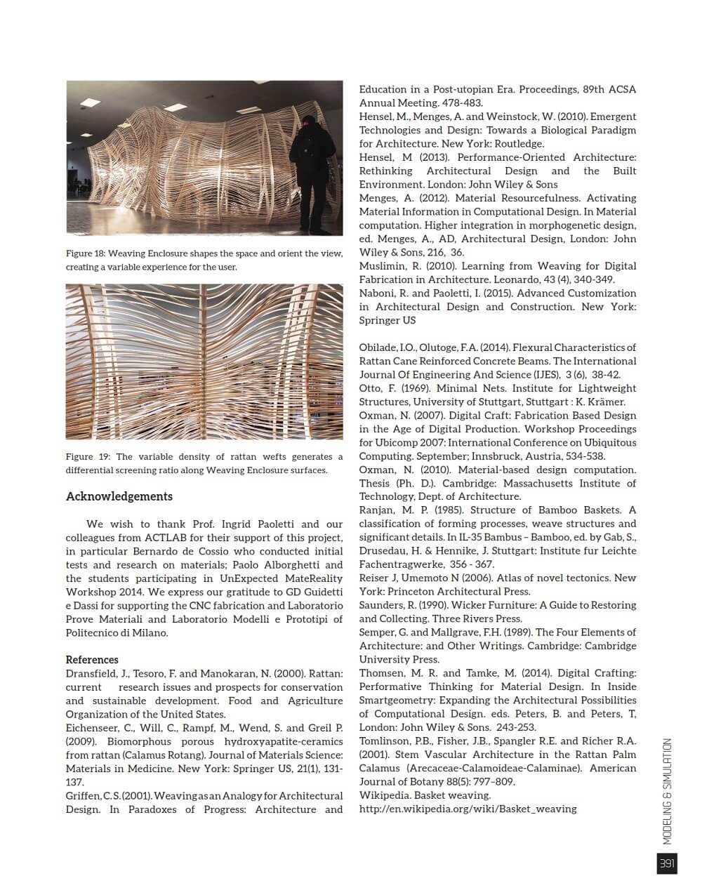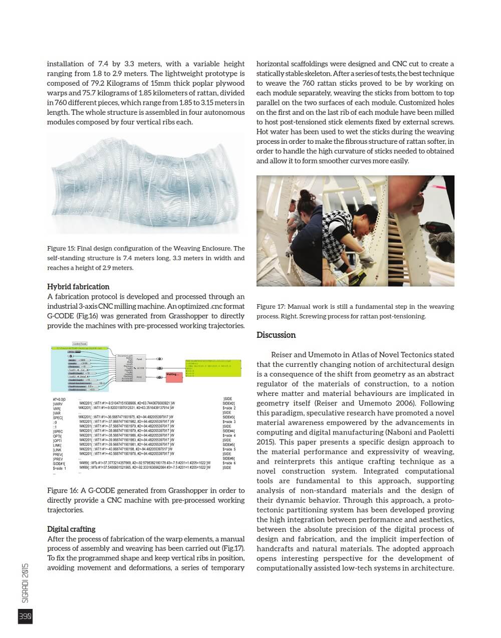 This paper by Roberto Naboni and Luca Breseghello presents a computationally based methodology arising from the application of weaving techniques for the design and construction of an experimental architectural system, Weaving Enclosure. The research explores the close correspondence between material properties and assembly systems found in the traditional craft of weaving, studied through analytical and laboratory tests, and then implemented through computational design and digital fabrication.