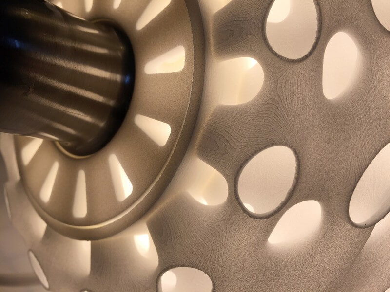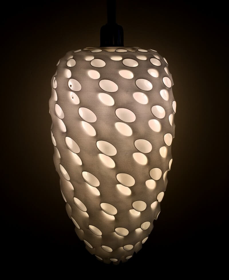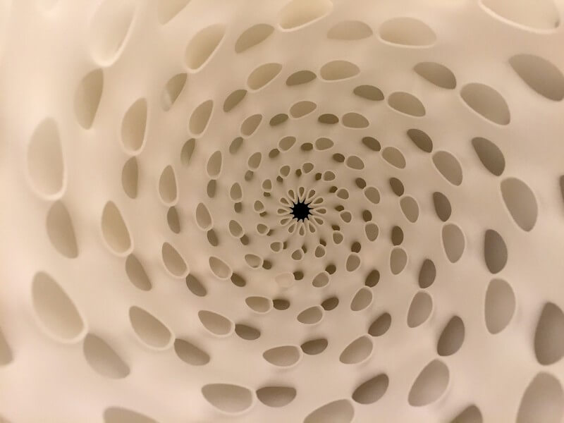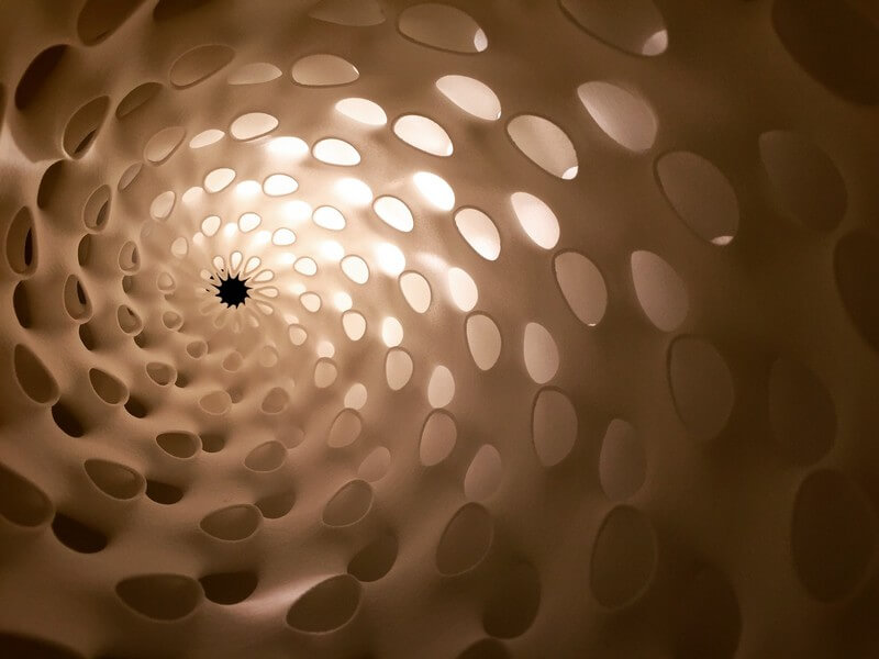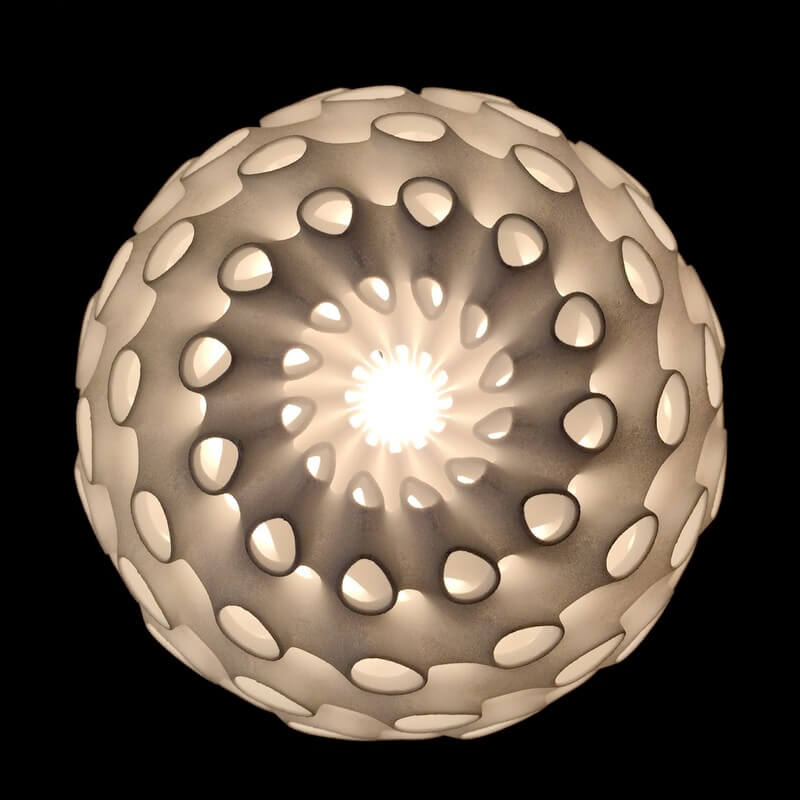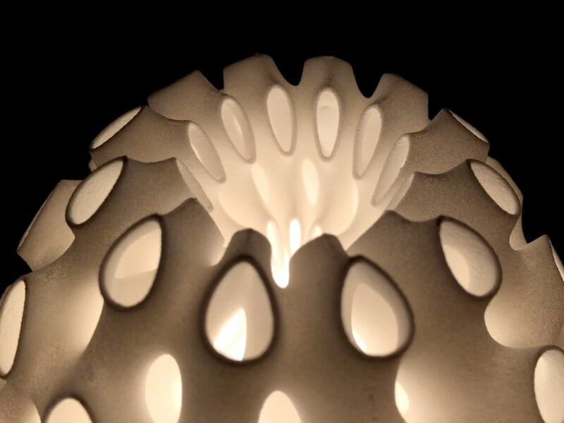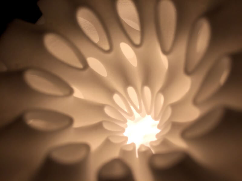 Whorl Lamps by Andrew Kudless, Matsys design studio are composed of three interconnected layers of 3D-printed nylon. The thinness of the material allows light to transmit through it while the curved geometry adds stiffness.