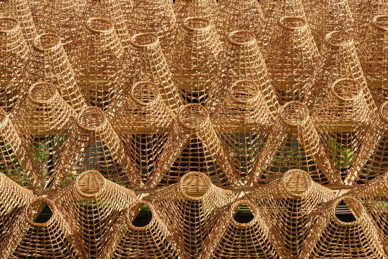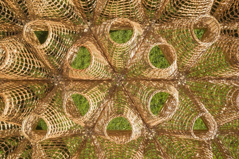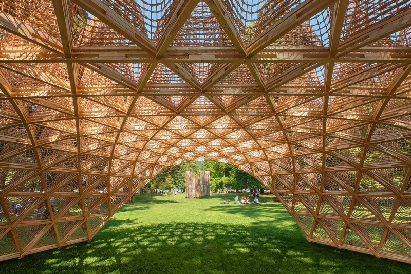 Pavilion offers beautiful views to the surrounding nature, thus creating a communion between the sheltered space and the exterior. Filtered daylight through pavilion creates dynamic shadow patterns on the grass. The pavilion is designed using timber grid shell structure technique and cowered with 262 traditional wicker baskets in a cone shape, weaved by Latvian craftsmen.