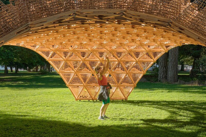 The Wicker Pavilion is designed combining contemporary architecture and traditional craftsmanship. It offers a place for relaxation and meditation in the heart of Jardins de l’Europe in Annecy, France. The pavilion blends in with the surrounding landscape and forms a shaded space for park visitors to shelter from the hot summer sun.