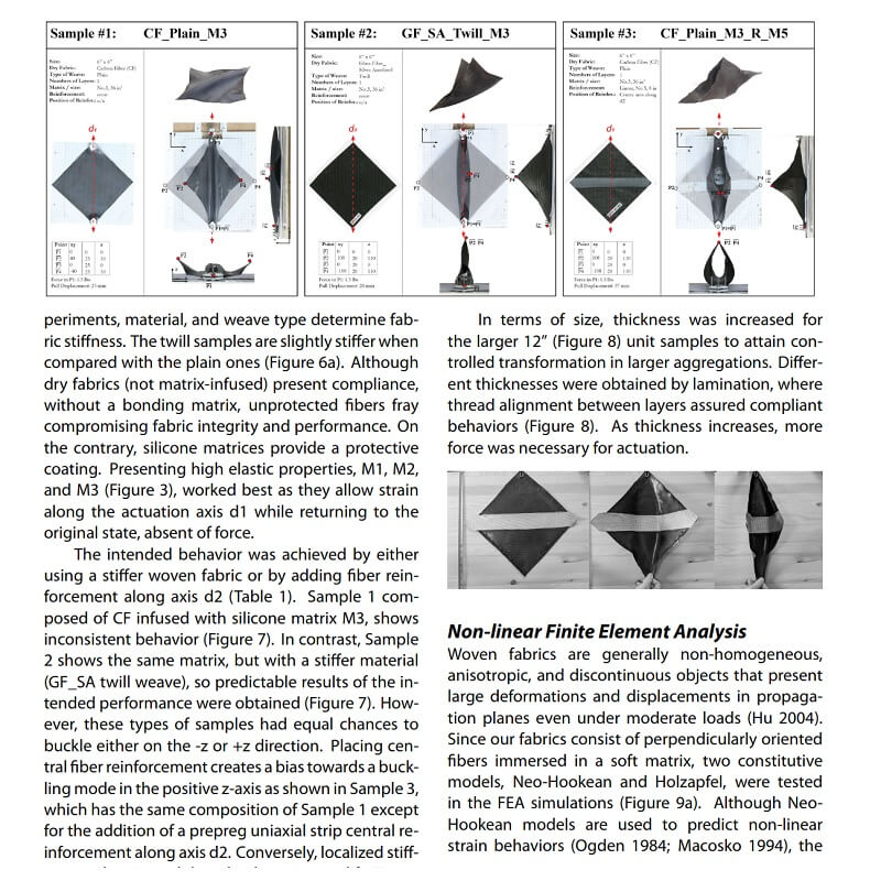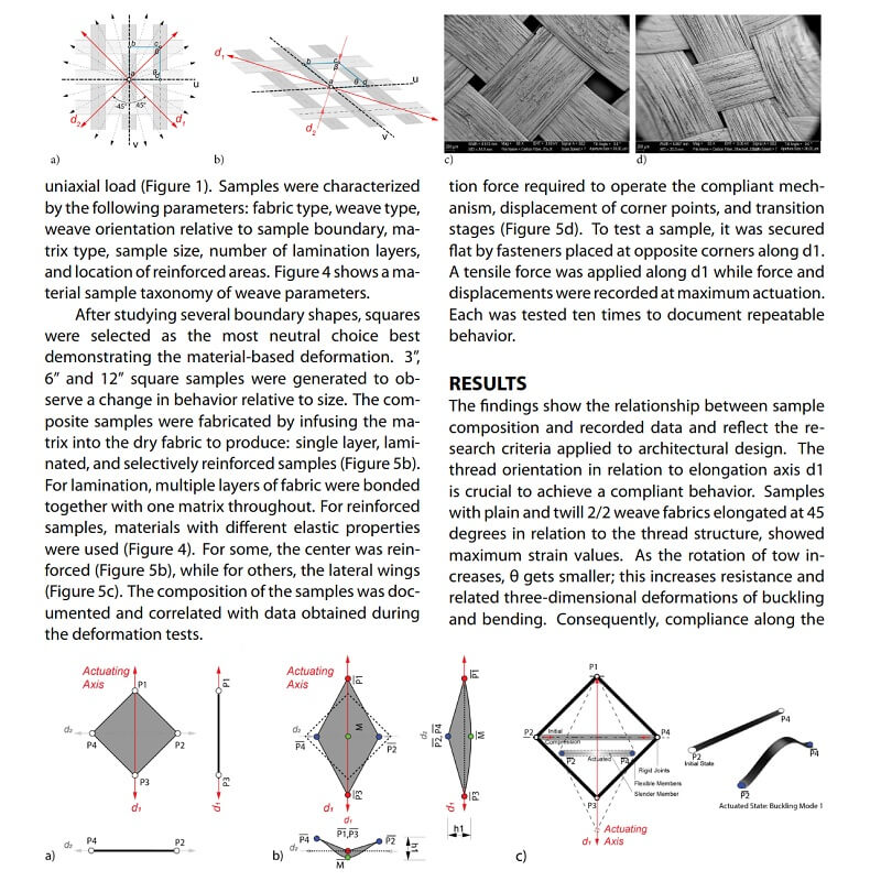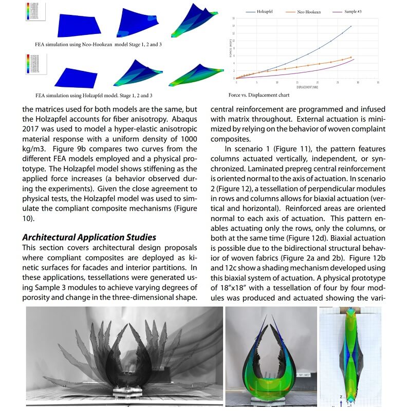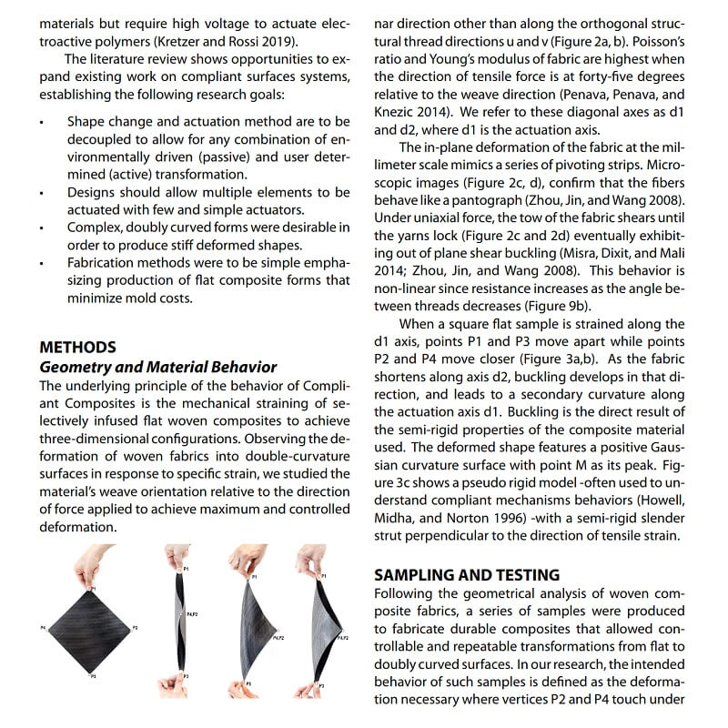 Compliant composites are a new approach to composite systems that leverage the semi-rigid properties of composite woven fabrics to create kinetic compliant mechanisms. In this paper by Olga Mesa, Saurabh Mhatre and Martin Bechthold, Simple fabrication and economic actuation principles are proposed to transform planar fabrics into three-dimensional configurations without using expensive molds, instead, relying on the millimeter-scale mechanical interactions of woven composite fabrics.