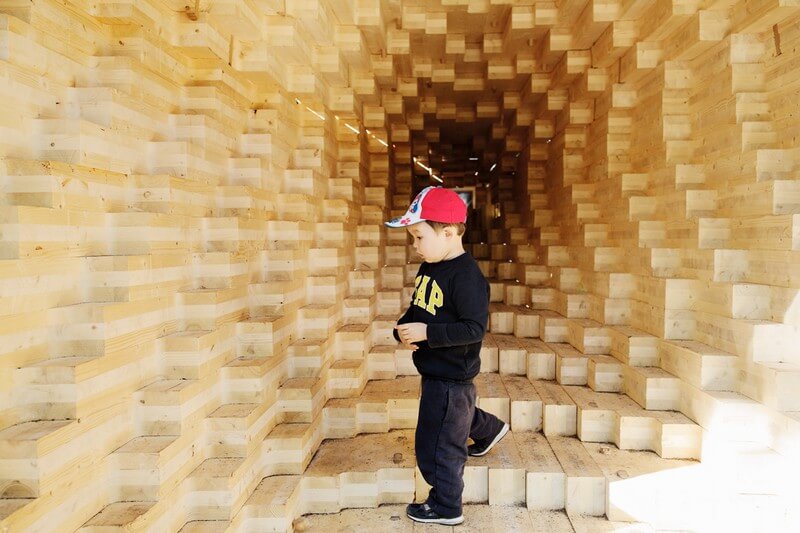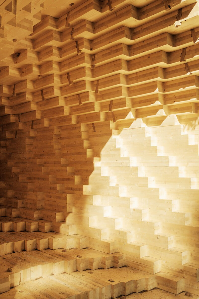 Y combines digital fabrication with handcraft, inspiring and revealing the possibilities of wood in modern construction. It encourages cross-border collaboration between architects and carpenters, as well as the combination of traditional working methods of fine carpenters with digital design and production. Y is built with horizontal prefabricated CLT-elements interlocked by 568 timber wedges and is itself like a large wooden joint made of CLT.